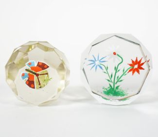 Konvolut von 2, wohl Böhmen/Tschechoslowakei, ca. 1900-1930, Schmetterling aus Glasfadenstücken mit. Kl. Gekreuzten Blütenstängeln, facettiert, nachgeschliffen u. wohl Deutschland, ca. 1920er/30er Jahre, drei Blumen mit Stängeln, facettiert, je min. altersbedingte Gebrauchsspuren (ex Coll. Peter v. Brackel)