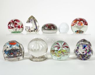 Sammlung von 9, meist Böhmen/Tschechoslowakei, ca. 1870-39, meist um 1900, versch. Dekore u. Formen, u.a. Trompetenblumen, Blasen, davon 1x medaillonförmige, Krone aus Glasfäden, 3x facettiert u. sog. Regenschirm aus Milchglas, Standfuß, dieses jedoch Whitall Tantum & Comp./Millville, New Jersey, 1x min. best., sonst min. altersbedingte Gebrauchsspuren (ex Coll. Peter v. Brackel)