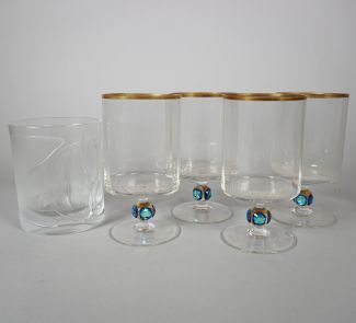Satz von 4, Herst. CJ Riedel je farbloses Glas, Scheibenfuß, kugeliger Schaft mit 4 blauchangierenden Farbsteinen, zylindrische umlaufend leicht gekantete Kuppa, Goldlippe, H ca 13 cm, dazu Tumbler, teilsatiniert, H. 10,5 cm, je Ätzmarke