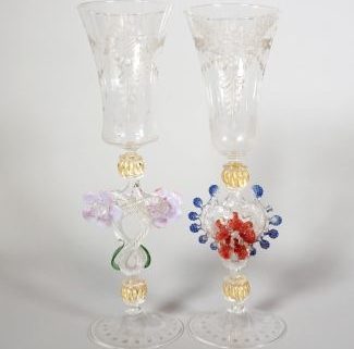 Gianfranco für Manuf. Salviati/Murano (wohl), Prunkgläser, Satz von 2, à la façon de Venise, Historismus-Epoche, farbloses Glas, Scheibenfuß, Schaft mit Herz bzw. Doppelspirale, Blütenbesatz, tlw. farblich abgesetzt, Nodi mit Goldflittereinschmelzungen, schlanke Kelchkuppa, umlaufend stilisierter Floraldekor in Mattschliff, H 30 cm, 1x beschädigt