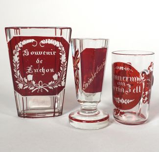 Konvolut von 3, Mitte 19. Jh., teilrubiniert, farbloses Glas, je beschriftet: Souvenir de Luchon, Erinnerung an Maria Zell u. Spindelmühle, versch. Formen, 1x Henkel, H 7,5 bis 10 cm