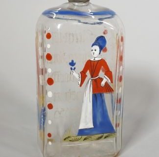 Süddeutsch o. alpenländisch, 1733, farbloses Glas, oktogonaler Stand, entspr. Korpus, dort polychrome Emaillemalerei einer eleganten Dame, Maiglöckchen, Punkten u. Sinnspruch, orig. gestöpselt, Abriss, H 15 cm