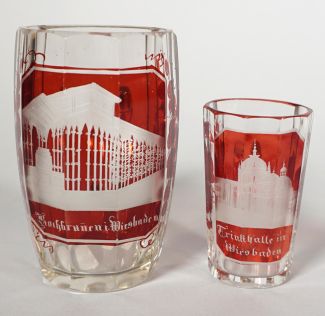 19. Jh., farbloses Glas, teilrubiniert, je Reserve mit geschliffener Ansicht des Kochbrunnen u. der Trinkhalle in Wiesbaden, je Henkel, H 10,5 bzw. 7,5 cm