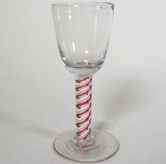 Norddeutschland/Niederlande, um 1800 oder früher, farblos, Scheibenfuß, im Schaft rot-weißer Faden, Kelchkuppa, H 13,2 cm, Abriss