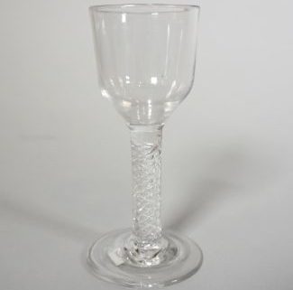 England, um 1800, farblos, Scheibenfuß, im Schaft Luftfaden, Kelchkuppa, H 12,1 cm, Abriss