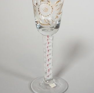 Norddeutschland/Niederlande, um 1800 oder früher, farblos, Scheibenfuß, im Schaft rot-weißer Faden, Kelchkuppa, Goldlippe, Mattschliff einer Blume, H 13,3 cm, Abriss