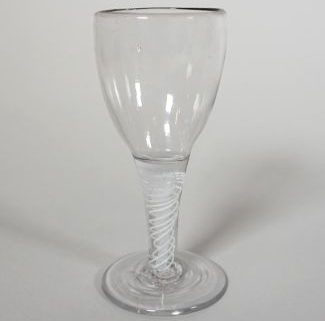 Norddeutschland/Niederlande, um 1800 oder früher, farblos, Scheibenfuß, im Schaft weißer Faden, Kelchkuppa, H 11,8 cm, Abriss