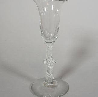 Norddeutschland/Niederlande, um 1800 oder früher, farblos, Scheibenfuß, im Schaft weißer Faden u. Nodus, Glockenkuppa, H 16,2 cm, Abriss