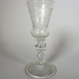 wohl 18. Jh., Lauenstein (?), farblos, Nodusschaft mit Luftblasen, in der Kelchkuppa u. Scheibenfuß wahrscheinlich spätere Mattschliffdekoration, Hirsche mit Sinnspruch bzw. Eichenkranz, H 25 cm, Abriss geschliffen
