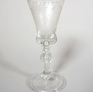 Norddeutschland, 19. Jh., farblos, gedrückter Trompetenfuß mit umgeschlagenem Rand, Nodusschaft, in der Kelchkuppa Mattschliff, Wappen wohl Hannover, H 18,5 cm, Abriss
