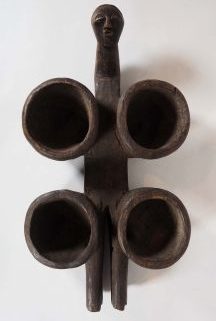 Luba/Kongo, Holz, geschnitzt, stilisierter, plastischer Torso mit Kopf und 4 schalenförmigen Kammern, unvollständig, 69 x 37 x 12 cm, Gebrauchsspatina