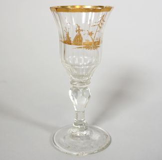 späte Biedermeier-Epoche, Böhmen, farblos, Scheibenfuß, facettierter Nodusschaft, umlaufend gekantete Kelchkuppa mit Goldmalerei einer galanten Dame in Landschaft, Goldlippe, dort mehrfach alt best., H 14,5 cm