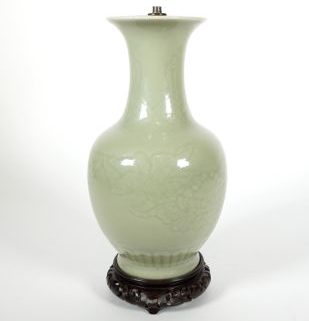 China, Porzellan, seladonfarbener Scherben, allseits Flachrelief Vegetaldekor, spätere Montage für Elektrifizierung, diese mit Holzsockel (rest), H über alles 32 cm