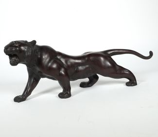 Japan, Bronze, dunkel patiniert, Schreitender und brüllender Tiger, Streifenmuster, 17,5 x 45,5 cm