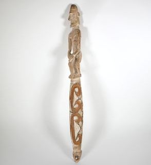 Papua Neuguinea, Holz, geschnitzt, polychrom, obere Hälfte vollplastische männliche Figur, untere Hälfte Ornamentik, L ca. 89 cm, min. besch.