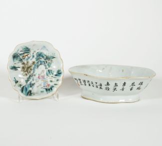 Konvolut von 2, China, 2. Hälfte 19. Jh., Porzellan, polychrome Emaille-Malerei, buddhistische Symbole, River Lee-Landschaft, Floraldekor und Kalligrafie, im Boden rote Blockmarke, 1x gemalt, dort rotes Siegel, 6,2 x 18,5 x 14 bzw. 4,5 x 12 x 12,5 cm, 1x Stand mit altem Chip ca. 1 cm
