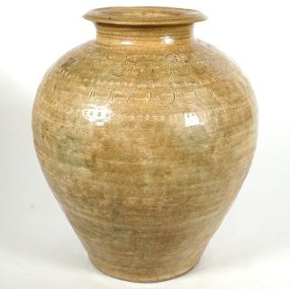 China, Keramik, beige-changierende Überlaufglasur, ovoider Korpus, in der Schulter gepunzter Schuppen u. Punktdekor sowie zwei Reliefs liegender Achten, H ca. 31,5 cm