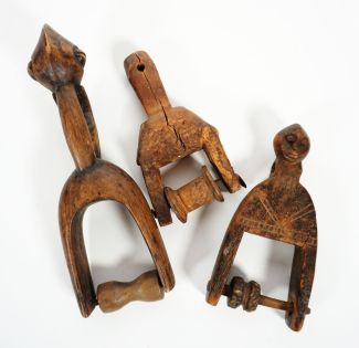 Elfenbeinküste, Stamm der Senufo, Holz, geschnitzt, patiniert, teilweise Schnitzdekor, 1x Kopf, 1x stiliserter Kopf, H ca. 25 bis 16 cm, Gebrauchsspuren
