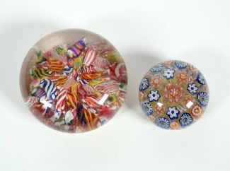 Konvolut von 2, ca. 1870-1910, wohl Schlesien, End-of-the-day-Paperweight mit bunten Filigranstangen u. eins mit zwei Millefiori-Ringen um zentrales Cane über Doppelspiralkissen in gelb u. weiß, Dm. 7,5 u. 5 cm, minimalste altersbedingte Gebrauchsspuren (ex Coll. Peter v. Brackel)