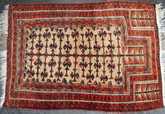Beloutsch, antik, handgeknüpft, Restaurierungsstelle, Fransen ungleichmäßig abgelaufen, ca. 135 x 100 = ca. 1,35 m²
