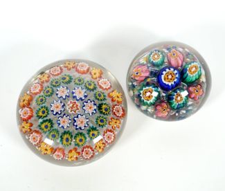 Konvolut von 2, ca. 1870-1905, wohl Schlesien u./o. Böhmen, zentrales Cane umringt von drei Millefiori über Doppelspiral-Latticiniokissen u. zentrales Millefiori-Cane umringt von sieben Canes auf Kröselkissen, Dm. 6,5 u. 5 cm, minimalste altersbedingte Gebrauchsspuren (ex Coll. Peter v. Brackel)