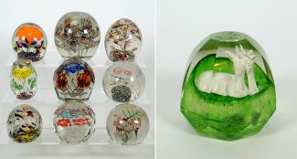 Sammlung von 10, 1880-1940, wohl meist Böhmen/Tschechoslowakei, u.a. Baruth/Brandenburg, Thüringen u. Weißwasser/Oberlausitz, versch Formen u. Dekore, u.a. Trompetenblumen u. Sulphides-Rehboch, tlw. Facettiert, H von 6,5 bis 10 cm, minimalste altersbedingte Gebrauchsspuren, tlw. best. (ex Coll. Peter v. Brackel)