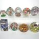 Konvolut von 3, ca. 1920-39, wohl Böhmen/Tschechoslowakei, versch. Formen u. Dekore, Sulphides-Taubenpaar auf Steinhügel, -Zwerg mit Bierseidel u. -Hase neben -Hund unter Blüte, je facettiert, H von 9 bis 9,5 cm, minimalste altersbedingte Gebrauchsspuren (ex Coll. Peter v. Brackel)