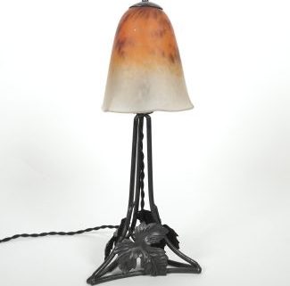Glashütte Schneider/Paris, 1920/30er Jahre, Milchglasschirm mit polychromen getupften Pulvereinschmelzungen, Ätzmarke, minimalste Gebrauchsspuren, schmiedeeisender Dreibeinstand mit entspr. Blattdekor, Bajonettgewinde, orig Stoffkabel, Bakelitschalter u. -Stecker