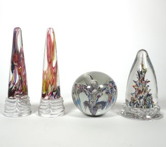 Konvolut von 4, ca. 1870-1825, wohl Val St. Lambert, Werk Seraing/Belgien u. Frankreich, versch Formen u. Dekore, u.a. Stalagmiten-Paperweights u. Kegelform, H von ca. 9 bis 18,5 cm, minimalste altersbedingte Gebrauchsspuren (ex Coll. Peter v. Brackel)