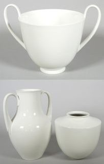 KPM/Berlin, weiß, H 15,5 cm, dazu Vase „Salier“ H. 23,5cm, diese am Henkel Haarriss, dazu Hölderlinbecher, 14 x 19 cm, je blaue Zeptermarke unter Glasur, je 1. Wahl