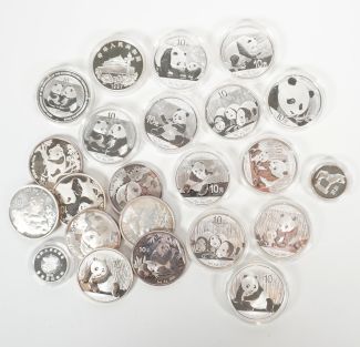 20x 10 Yuan, Panda, aus 1994-2021, Anlagemünzen Silber, + 1x 10 Yuan Hongkong, zus. 17 Unzen + 4x je 30g 999er-Silber, dazu 2x 10 Yuan, je 8g 999er-Silber