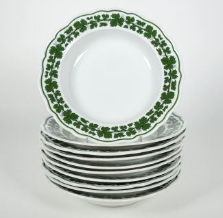 Staatl. Porzellanmanuf Meissen, Satz von 10, Dekor Voller grüner Weinkranz/Weinlaub, Form Neuer Ausschnitt, Dm 24 cm, je blaue Schwertermarke unter Glasur