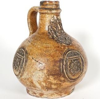 Frechen, 17. Jh., Steinzeug, im kugeligen Korpus Releifmedaillons, zentral Wappenschild mit Lippscherrose, H ca. 15 cm, Rand altersbedingt best., Gebrauchsspuren