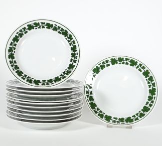 Satz 12, Staatl. Porzellanmanufaktur Meissen, Dekor Weinlaub, DM. ca. 18,5 cm, je blaue Schwertermarke unter Glasur, 9x 2 Schleifstriche, 3x 1. Wahl