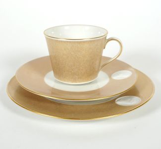 PETRI, Trude (*1906 Hamburg †1998 Vancouver) für Porzellanmanuf KPM/Berlin, Mokkagedeck, 3 tlg., Dekor/Form Arkadia, Goldfahne/-wandung, blaue Zeptermarke und rote Reichsapfelmarke unter/über Glasur, tlw min berieben
