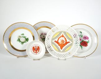 Konvolut von 5, Porzellanmanuf KPM/Berlin, bestehend aus: Paar Ziertellern, zentral Apfelblüte bzw Schneeball, goldsilhouettierte Fahne (leicht berieben), Korbmuster, Dm. 23,5 cm, Teller, 1849-1870, zentral Blumenmalerei, Goldrand, Dm. 23,5 cm, Durchbruchteller, zentral Galantes Paar im Stile des Rokoko, im Boden grüne STB-Marke und Schälchen, zentral Feuersozietät der Provinz Brandenburg 1719 sowie Adler, Dm. 12 cm, 4x rote Reichsapfelmarke und je blaue Zeptermarke unter/über Glasur, tlw min Gebrauchsspuren