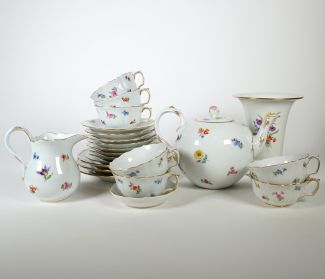 Kgl. u Staatliche Porzellan-Manufaktur Meissen, bestehend aus: 7 Tassen mit 8 Unteren, 3 Tellern, kleines Schälchen u Kratervase, H ca. 16 cm, je blaue Schwertermarke unter Glasur, je 1. Wahl