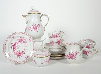 Staatliche Porzellanmanuf. Meissen, Form neuer Ausschnitt, indische Blume purpur-camaieu, bestehend aus: vier dreiteiligen Gedecken, Kanne, Milchkännchen u. Zuckerdose, je blaue Schwertermarke unter Glasur, 2 Schleifstriche