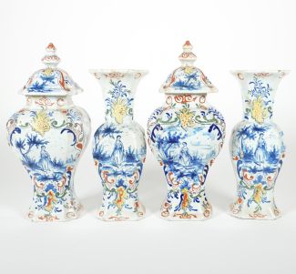 4 Stück, Manuf. De Porceleyne Fles/Deflt, 2. Hälfte 18. Jh., Fayence, Balusterform, 2x mit Deckel, allseits polychrome Rocaillemalerei, in der Front entspr. Reserve mit blaumonochromer Malerei einer Frau in Landschaft, blaue u. rote Marken, H u. H, tlw. altersbedingt best., tlw. rest., 1x Krakelee, H 21 bzw. 25 cm