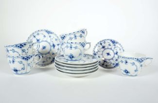 Satz von 5, 3 tlg., Porzellanmanuf Royal Copenhagen, Dekor Musselmalet Halbspitze gerippt, dazu eine weitere Untere sowie eine Untere für Mokkatasse, je blaue Wellen- und grüne Stempelmarke unter Glasur