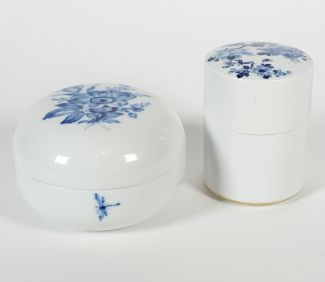 Prof. Heinz für Staatliche Porzellan-Manufaktur Meissen, Deckeldose, kobaltblauer Blumendekor, 1. Wahl, H ca. 10,5 cm, dazu 1 weitere, jdeoch gedrückt-kugelige Form, blaue Blume, 1x 2 Schleifstriche, je blaue Schwertermarke unter Glasur