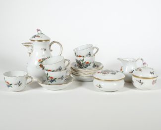 Staatliche Porzellan-Manufaktur Meissen, „Chinesischer Schmetterling“, Kakimon-Dekor, bestehend aus: Kanne, 5 Tassen (1x Randchip), 6 Unteren, Sahnekännchen, Zuckerdose und Dose, je blaue Schwertermarke unter Glasur, 1. Wahl