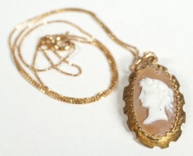 England, hochovale Form mit Frauenbüste, Krappenfassung, 9k, MZ, kl. Ausbruch, dazu Venezianerkettchen, Italien, 375er Gold, je Beschau, zus. ca. 3g Gold total