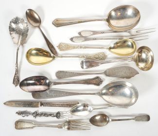 versch. Manuf, Dekore u. Stile, bestehend aus: kl. Suppenkelle, 7 Löffeln, versch. Größen u. Funktionen, 2 Vorlegelöffel, Gabel, 2 Aufschnittgabeln, Fischmesser, Obstmesser u. Sardienenheber, MZ, Beschau, zus. ca. 670g mind. 800er Silber