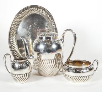 Manuf. Koch & Bergfeld/Bremen, Historismus-Epoche, Barockstil, geschweift godroniert, Reliefdekor, Kanne mit Blütenknauf, Zuckerdeckel fehlt, Tablett im Spiegel Rocaillien, MZ, Beschau, zus. ca. 1072g 800er Silber