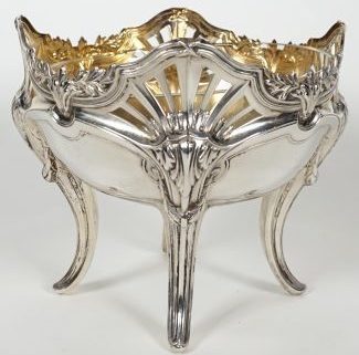 deutsch, 1910er Jahre, Louis XVI Stil, kugelförmige durchbrochen gearbeitete Manschette auf 4 c-förmig ausgestellten Füßen, allseits Reliefdekor von Festons, Blättern etc, Innenvergoldung, MZ, Beschau, ca 160gr 800er Silber, dazu späterer Glaseinsatz, 13,5 x 14,5 cm