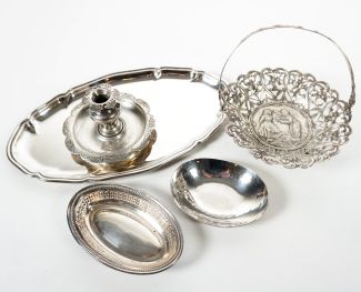 versch Manuf und Stile, 19./20. Jh., bestehend aus: spitzovalem Tablett 15 x 25 cm, durchbrochen gearbeiteter Tischkorb mit Henkel (1 Anstoß abgebrochen), Kerzenleuchter und 2 ovale Schälchen, je MZ, Beschau, zus ca 475gr min 800er Silber