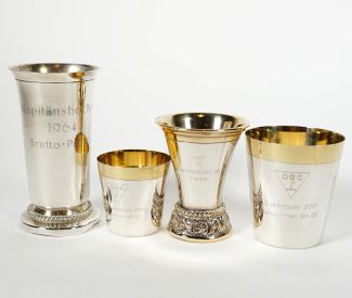 Sammlung von 4, 3x Osnabrücker Golf Club, 1968 und 2x 2017, versch Formen zylindrisch, konisch und trompetenförmig, je Innenvergoldung (1x berieben), in der Wandung graviert, H. 6 bis 12,5 cm, je MZ, Beschau, zus ca 410gr min 800er Silber, 1x Stand gedellt
