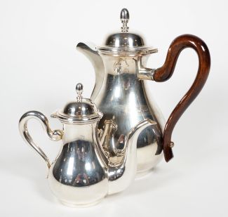 Manuf Zaramella/Padua, Birnform, Gießnase, Klappdeckel, 1x hölzerner Ohrhenkel, MZ, Beschau, zus ca 975gr 800er Silber, H. 23 cm