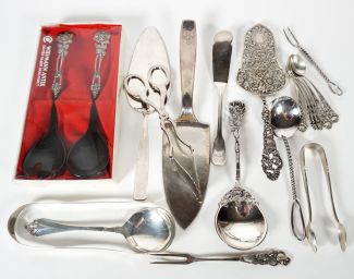 versch Manuf, meist deutsch, bestehend aus: 3 Tortenhebern, Gebäckzange, 3 Sahnelöffeln, 2 Zuckerzangen, Mokkalöffeln, Satz von 6, Art Hildesheimer Rose, zwei Vorlegegabeln und ein Weichkäsemesser, je MZ, Beschau, zus ca 510gr min 800er Silber, dazu 2tlg Obstsalatbesteck, 835er Silberhefte, MZ, Beschau, orig Karton (besch)